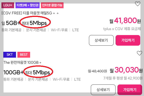 나는 성격이 급해서 빨리 빨리 아니면 답답하다 싶은 분들은 퀄리티있게 5Mbps가 붙어있는 요금제로 가셔야 합니다. 다른 요금제에 비해서 물론 가격은 조금 더 있습니다. 평생 매월 42,900원 또는 41,800원입니다. 이 정도면 적당한 가격이라 생각되는데요. 티플러스 알뜰폰 요금제 중에 5Mbps 속도로 데이터를 무제한 이용할 수 있는 상품이 2개 있습니다.