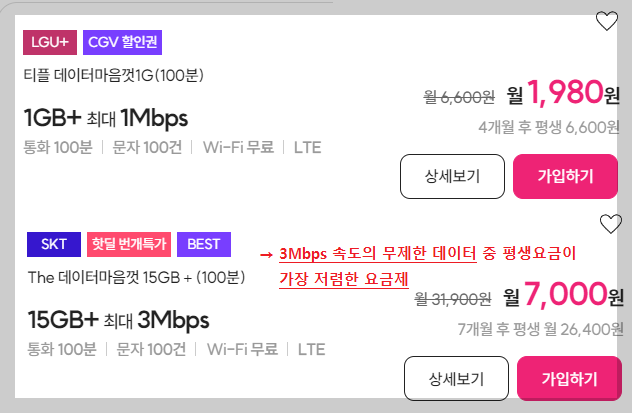 현재 핫딜 특가로 10GB 요금제가 월1,000원 미만으로 이벤트 진행 중입니다. 3개월이나 6개월 처럼 짧은 기간이 아닌 12개월 동안 월990원입니다. 번외로 전화, 문자 필요없이 카톡이랑 인터넷 서핑 용도로만 찾으시는 분들도 있습니다. 그런 분들은 티플러스에서 제공하는 '데이터안심옵션 부가서비스'를 이용하는 게 오히려 이득입니다. 가장 저렴한 요금제를 선택하세요. 그리고 '데이터 안심옵션' 부가서비스를 넣으세요. 데이터안심옵션 부가서비스는 데이터가 모두 소진된 후에도 분당 요금이 계속 추가되지않고 월5,000원(부가세포함 5,500원)이면 무제한으로 데이터를 쓸 수 있는 부가서비스입니다. 단, 제한 속도 400Kbps라서 카톡, 웹사이트 이용에 큰 불편함을 느끼지 않는 속도입니다. 티플러스에서 제공하는 서비스입니다.